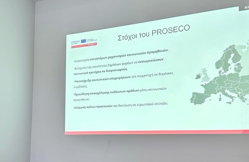 Το ευρωπαϊκό έργο PROSECO στοχεύει στην προώθηση της Κοινωνικής και Αλληλέγγυας Οικονομίας (Κ.ΑΛ.Ο.) μέσω της ενίσχυσης της συνεργασίας μεταξύ φορέων, της ανάπτυξης των κοινωνικών προμηθειών και της αξιοποίησης καινοτόμων πρακτικών για τη βελτίωση των δημόσιων συμβάσεων. Το έργο μέσω της καταγραφής των ευκαιριών, των προβλημάτων και των καλών πρακτικών στις ευρωπαϊκές Περιφέρειες του προγράμματος, στοχεύει στο να συμβάλει στη δημιουργία ενός ισχυρού πλαισίου για την ενίσχυση της κοινωνικής επιχειρηματικότητας, της στήριξης των ευάλωτων ομάδων και τη βιώσιμη ανάπτυξη.