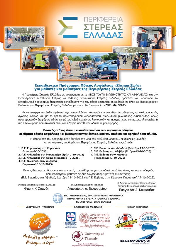 Η Περιφέρεια Στερεάς Ελλάδας σε συνεργασία με το «ΙΝΣΤΙΤΟΥΤΟ ΒΙΩΣΙΜΟΤΗΤΑΣ ΚΑΙ ΑΣΦΑΛΕΙΑΣ» και την Περιφερειακή Διεύθυνση Α/θμιας και Β/θμιας Εκπαίδευσης Στερεάς Ελλάδας, πρόκειται να υλοποιήσει το εκπαιδευτικό πρόγραμμα βιωματικής εκπαίδευσης για την οδική ασφάλεια σε μαθητές/τριες σε όλες τις Περιφερειακές Ενότητες της Περιφέρειας Στερεάς Ελλάδας με την κωδική ονομασία: «ΖΗΤΗΜΑ ΖΩΗΣ».