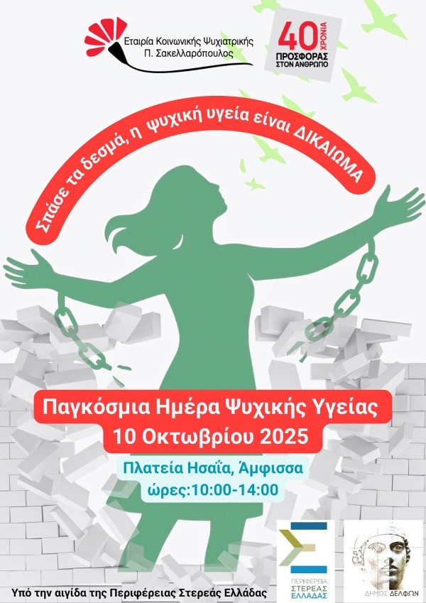 Η Εταιρία Κοινωνικής Ψυχιατρικής Π. Σακελλαρόπουλος – υπηρεσίες Ν. Φωκίδας σε καλεί να σταθείς δίπλα μας στη φετινή καμπάνια για την Παγκόσμια Ημέρα Ψυχικής Υγείας, η οποία θα πραγματοποιηθεί την Παρασκευή 10 Οκτωβρίου 2025 στην Πλατεία Ησαΐα στην Άμφισσα (10:00 – 14:00), με την υποστήριξη του Δήμου Δελφών και υπό την αιγίδα της Περιφέρειας Στερεάς Ελλάδας.