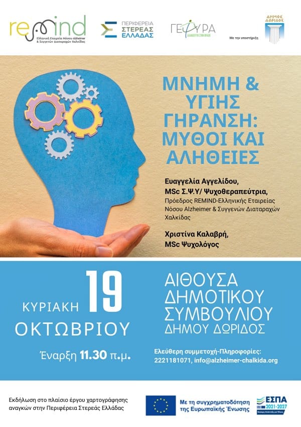 Η REMIND-Alzheimer Χαλκίδας, σε συνεργασία με την Περιφέρεια Στερεάς Ελλάδας και με την υποστήριξη του Δήμου Δωρίδος, διοργανώνει αυτή την εκδήλωση με στόχο την παρουσίαση τεκμηριωμένων επιστημονικών δεδομένων σχετικά με τη μνήμη και την υγιή γήρανση, καθώς και πρόσφατα ευρήματα τοπικής έρευνας σε άτομα άνω των 60 ετών.