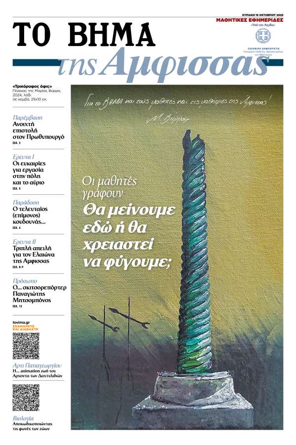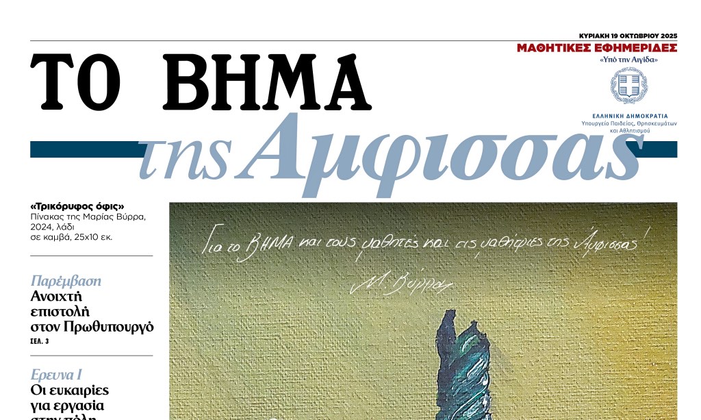 Με το ΒΗΜΑ κυκλοφορεί, αυτή την Κυριακή 19 Οκτωβρίου 2025 η μαθητική εφημερίδα «ΤΟ ΒΗΜΑ της Άμφισσας».