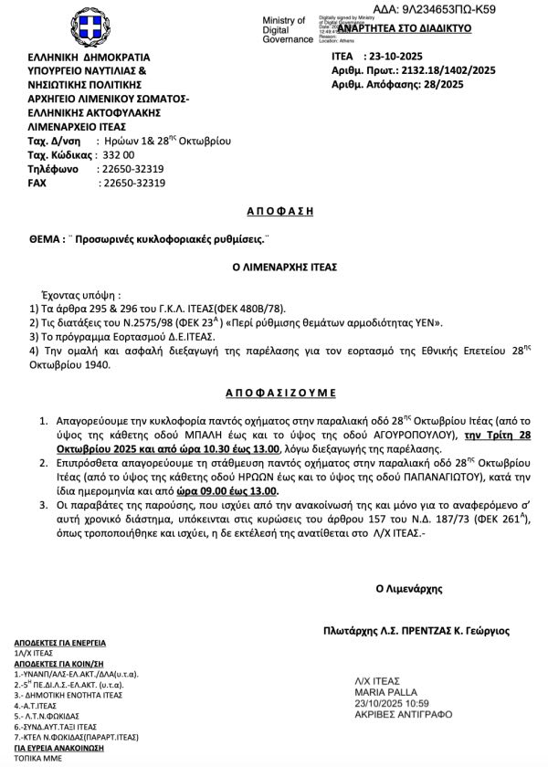 Δημος Δελφων Οι κυκλοφοριακές ρυθμίσεις στην Ιτέα για την 28η Οκτωβρίου 23 Οκτωβρίου 2025 217 0 Ανακοίνωση από το Λιμεναρχείο Ιτέας ΣΧΕΤΙΚΑ ΑΡΘΡΑ Πέντε συλλήψεις για ναρκωτικά σε Άμφισσα και Ιτέα Θερινός Δίαθλος με ρόλερ σκί ο ΣΧΟ Ιτέας-Κίρρας Δακοκτονία αύριο στην Δ.Ε. Άμφισσας
