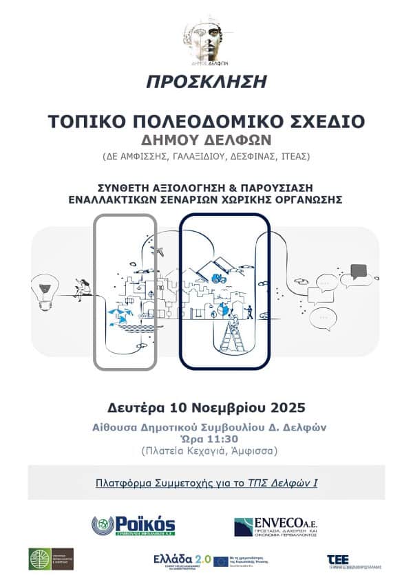 Ο Δήμος Δελφών, στο πλαίσιο της εκπόνησης της μελέτης «Τοπικό Πολεοδομικό Σχέδιο (ΤΠΣ) Δήμου Δελφών (Δ.Ε. Άμφισσας, Γαλαξιδίου, Δεσφίνας και Ιτέας)» διοργανώνει ανοιχτή εκδήλωση για την παρουσίαση των εναλλακτικών σεναρίων χωρικής οργάνωσης της περιοχής μελέτης.