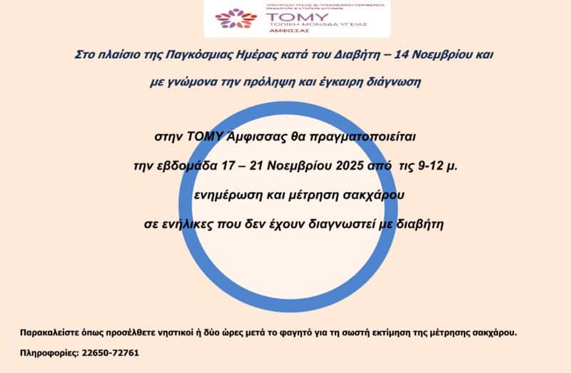 Φωκίδα Δράση για τον σακχαρώδη διαβήτη από ΤΟΜΥ Άμφισσας 12 Νοεμβρίου 2025 205 0 Ανακοίνωση από την ΤΟΜΥ Άμφισσας ΣΧΕΤΙΚΑ ΑΡΘΡΑ “Στα παλιά της παπούτσια η κυβέρνηση Φωκίδα, Βοιωτία και Εύβοια” Εγκρίθηκε η πρόταση για υποδομές πρόσβασης ατόμων με κινητικά προβλήματα σε παραλίες Σε κατάληψη το ΕΠΑΛ Άμφισσας