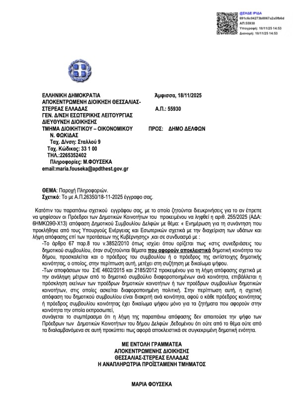 Υγ: επισυνάπτεται η αρνητική απάντηση του ελεγκτή νομιμότητας της Αποκεντρωμένης Διοίκησης Θεσσαλίας-Στερεάς Ελλάδας, για το αν έπρεπε βάσει κανονισμού να ψηφίσουν οι Πρόεδροι των Δημοτικών Κοινοτήτων κατά την πρόσφατη συζήτηση του Δημοτικού Συμβουλίου, σε συνέχεια ερωτήματος του Δήμου Δελφών