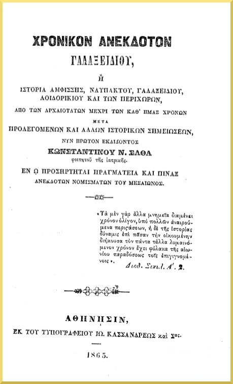 Συνομολογώντας την άποψη του Κ. Θ. Δημαρά «ότι η νεοελληνική γραμματεία τρέφεται από ύλη την οποία τής έχει προσφέρει ο Γαλαξειδιώτης ιστοριοδίφης», οι συμπατριώτες δεν άφησαν να περάσει η επέτειος των 160 χρόνων απ’ την 1η έκδοση του περίφημου Χρονικού. Το έγραψε ο ιερομόναχος Ευθύμιος, της ι.μ. Μεταμορφώσεως του Σωτήρος το 1703, το ανακάλυψε σε μια κρύπτη στα ερείπια της μονής ο δευτεροετής τότε – 1864 φοιτητής της Ιατρικής Κ. Σάθας και κάνοντας καθοριστική για τη ζωή του στροφή, ύστερα από σχολαστική επιμέλειαν, το εξέδωσε το 1865.