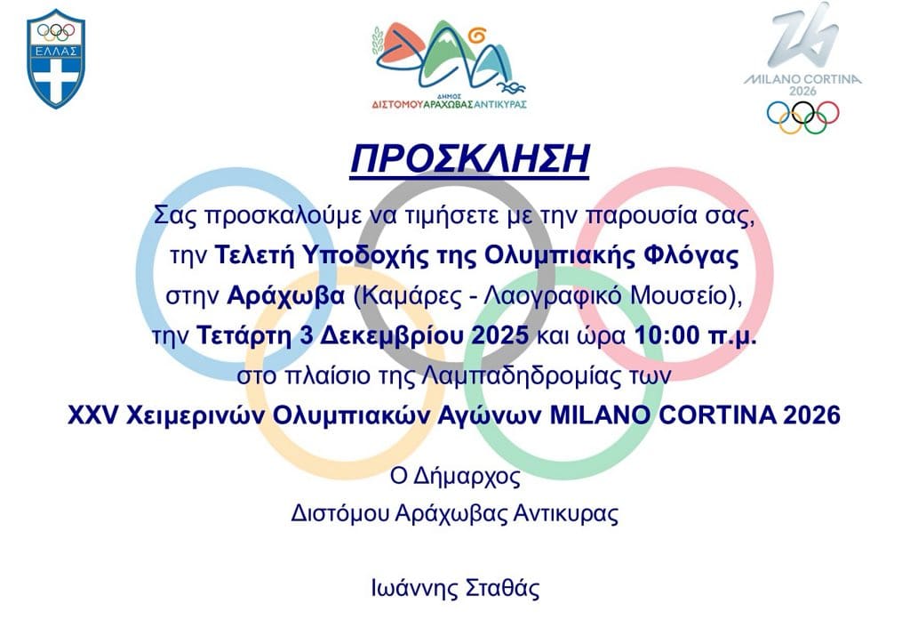 Εκδηλώσεις, Στερεα Ελλαδα Τελετή υποδοχής Ολυμπιακής Φλόγας στην Αράχωβα 26 Νοεμβρίου 2025 189 0 ΣΧΕΤΙΚΑ ΑΡΘΡΑ “Δράσεις και παρεμβάσεις του Δήμου Δελφών για την ανάπτυξη του τουρισμού” “Νυρεμβέργη” στην Κ.Λ. Άμφισσας “Ομαδική θεραπεία” στην Κ.Λ. Ιτέας