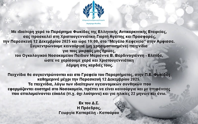 Εκδηλώσεις “Χριστουγεννιάτικη Γιορτή Αγάπης και Προσφοράς” 03 Δεκεμβρίου 2025 565 0 ΣΧΕΤΙΚΑ ΑΡΘΡΑ “Στην Αγάπη! Εκεί θα ανταμωθούμε!” Δύο ταινίες αυτή την εβδομάδα η Κ.Λ. Άμφισσας Μαζί στην Γιορτή – Εκδήλωση στο Μέγαρο Μουσικής Αθηνών
