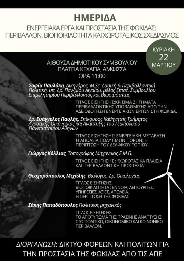Κυριακή 22 Μαρτίου και ώρα 11:00 π.μ. στην Αίθουσα του Δημοτικού Συμβουλίου (Πλατεία Κεχαγιά, Άμφισσα), συζητάμε τις κρίσιμες προκλήσεις που αντιμετωπίζει η περιοχή μας από την ανεξέλεγκτη εγκατάσταση ενεργειακών έργων, αλλά και ενημερωνόμαστε με το πώς ο εν εξελίξει χωροταξικός σχεδιασμός σχετίζεται άμεσα με τα προς αδειοδότηση έργα ΑΠΕ.