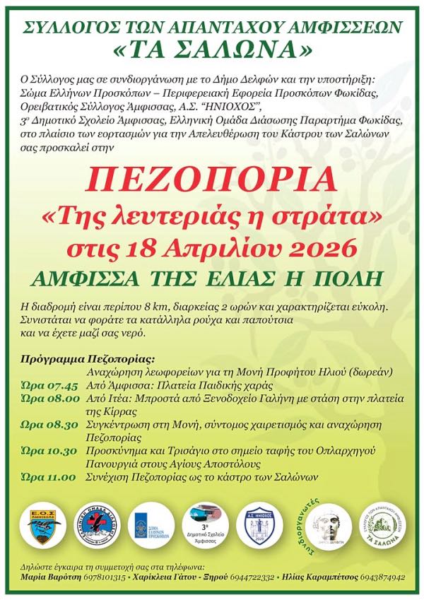 Εκδηλώσεις Πεζοπορία: “Της λευτεριάς η στράτα” 13 Απριλίου 2026 210 0 ΣΧΕΤΙΚΑ ΑΡΘΡΑ 2ο Αγιαθυμιώτικο αντάμωμα με τους “Κυρατζήδες” και “2η γιορτή πίτας” στις 2 Μαΐου! Αιμοδοσία στην Π.Ε. Φωκίδας στις 22 Απριλίου Η Έξοδος του Μεσολογγίου μέσα από το πανηγύρι τ’ Άη Συμιού