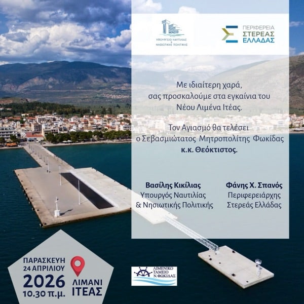 Εκδηλώσεις Εγκαινιάζεται το έργο του νέου λιμένα Ιτέας 22 Απριλίου 2026 262 0 ΣΧΕΤΙΚΑ ΑΡΘΡΑ 7oς σταθμός Παιχνιδομηχανής “Δράμα” και παιδική ταινία στην Κ.Λ. Άμφισσας αυτή την εβδομάδα Εκδήλωση για τον μεγάλο Αρχαιολόγο Χρ. Καρούζο