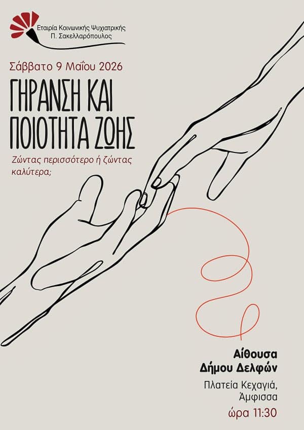 Η Εταιρία Κοινωνικής Ψυχιατρικής Π. Σακελλαρόπουλος διοργανώνει ημερίδα με θέμα «Γήρανση και Ποιότητα ζωής», με στόχο την ενημέρωση και την ευαισθητοποίηση της τοπικής κοινότητας γύρω από ένα ζήτημα που αφορά ολοένα και περισσότερο τη σύγχρονη κοινωνία.