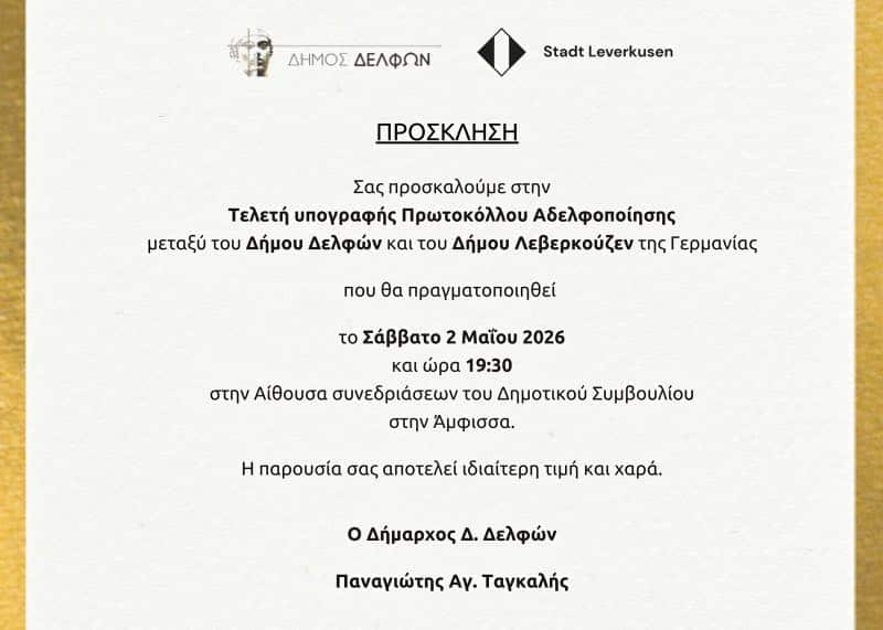 Οι Δήμοι Δελφών και Λεβερκούζεν της Γερμανίας επισφραγίζουν τους δεσμούς χρόνων που έχουν αναπτυχθεί μεταξύ τους, ανοίγοντας νέους δρόμους συνεργασιών, με την τελετή υπογραφής του Πρωτοκόλλου Αδελφοποίησης, η οποία θα πραγματοποιηθεί το Σάββατο 2 Μαΐου 2026, στις 19:30, στην αίθουσα συνεδριάσεων του Δημοτικού Συμβουλίου στην Άμφισσα.