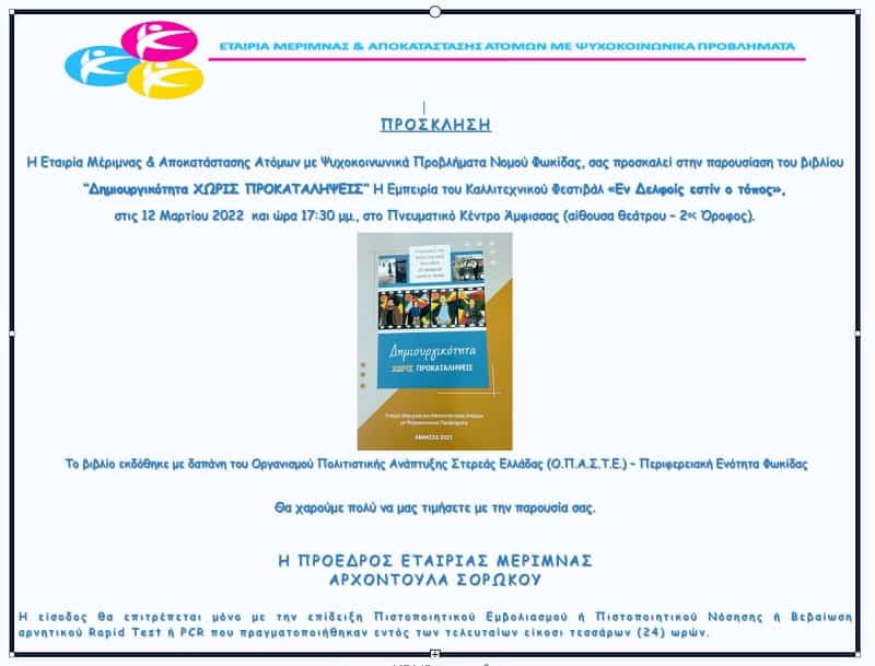 Εκδηλώσεις Παρουσίαση βιβλίου για το “Εν Δελφοίς εστίν ο τόπος” 23 Φεβρουαρίου 2022 705 0 ΣΧΕΤΙΚΑ ΑΡΘΡΑ “Στην Αγάπη! Εκεί θα ανταμωθούμε!” Δύο ταινίες αυτή την εβδομάδα η Κ.Λ. Άμφισσας Μαζί στην Γιορτή – Εκδήλωση στο Μέγαρο Μουσικής Αθηνών