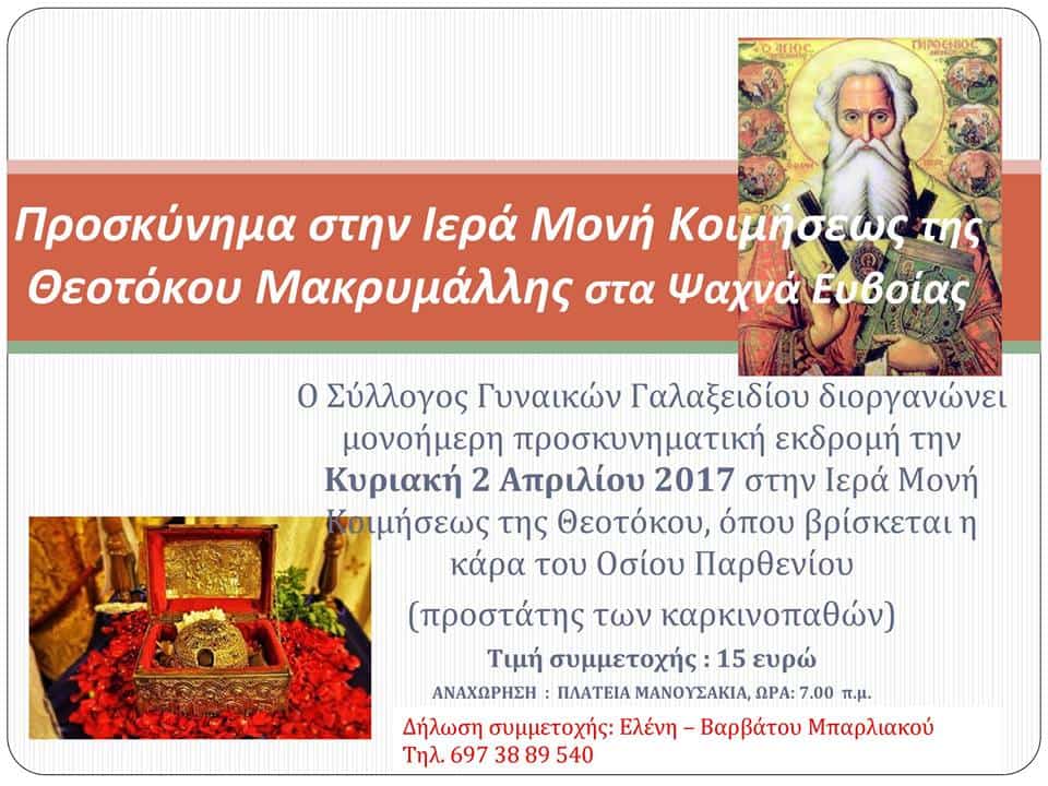 Ο Σύλλογος Γυναικών Γαλαξειδίου διοργανώνει μονοήμερη προσκυνηματική εκδρομή την Κυριακή 2 Απριλίου 2017 στην Ιερά...