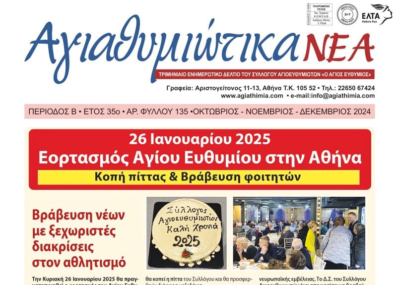 Ενημερωτικό δελτίο του Συλλόγου Αγιοευθυμιωτών Εορταστικό, πολύχρωμο και με πλούσιο περιεχόμενο, κυκλοφόρησε το χριστουγεννιάτικο (υπ’...