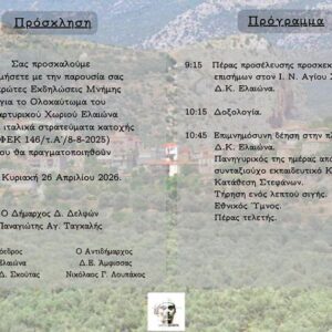 Ανακοίνωση από το Δήμο Δελφών Ο Δήμος Δελφών και η Δημοτική Κοινότητα Ελαιώνα προσκαλούν στις πρώτες Εκδηλώσεις Μνήμης για το...